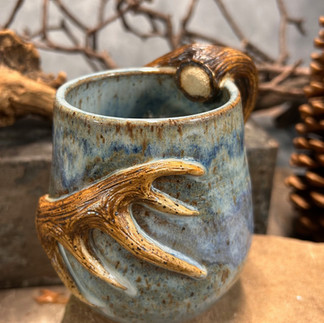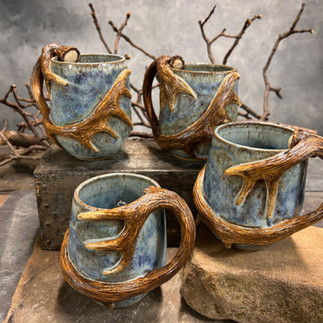 After weeks of testing glazes, late nights in the studio, and moments of frustration mixed with discovery, the final mugs came together exactly as I had pictured them: a flowing, light blue glaze with rich movement across the surface, paired with a deep brown antler handle that wraps around the mug like a piece of the wilderness itself.